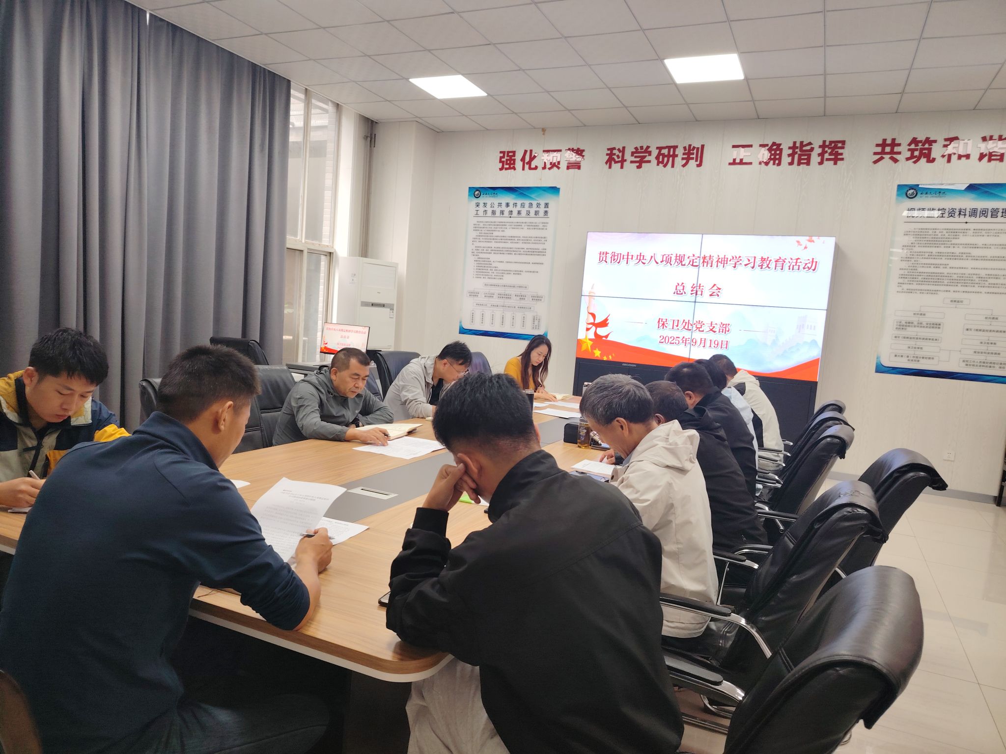 为深入贯彻落实中央八项规定精神,持续推动作风建设常态化长效化,2025年9月19日上午,保卫处党支部召开贯彻中央八项规定精神学习教育总结会。