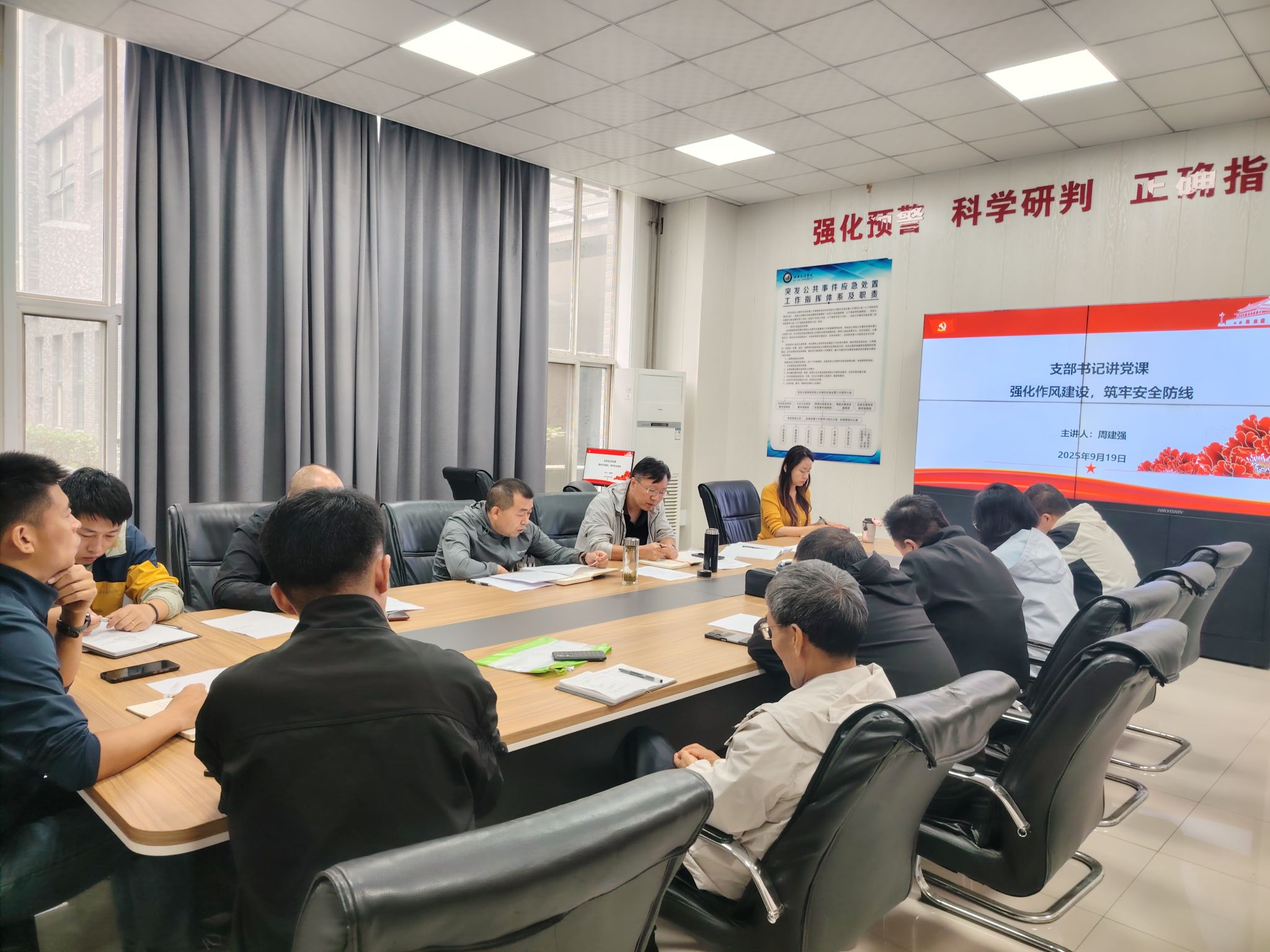 会议最后,支部书记周建强同志以“强化作风建设,筑牢安全防线”为题,讲授专题党课,要求深刻认识加强作风建设的极端重要性和现实紧迫性,指出作风问题本质是党性问题,关系人心向背,关乎事业成败;准确把握新时代保卫处作风建设的核心要求,强调要聚焦“严、实、细、快”四字标准,打造忠诚干净担当的保卫队伍;以实际行动推进作风建设走深走实,提出要从“思想引领、制度约束、监督执纪、文化浸润”四个维度同向发力,推动作风建设由“治标”向“治本”转变;坚持以上率下,发挥“头雁效应”,要求支部班子成员带头落实八项规定精神,带头整改“四风”问题,带头践行服务师生宗旨,以“关键少数”引领“绝大多数”。