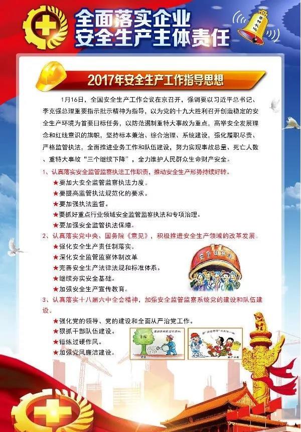 下面,就让小编以图片的形式带大家了解一下2017年安全生产工作的指导思想、习近平总书记关于加强安全生产的指示、新《安全生产法》的一些亮点以及一些关于安全生产方面的常识。