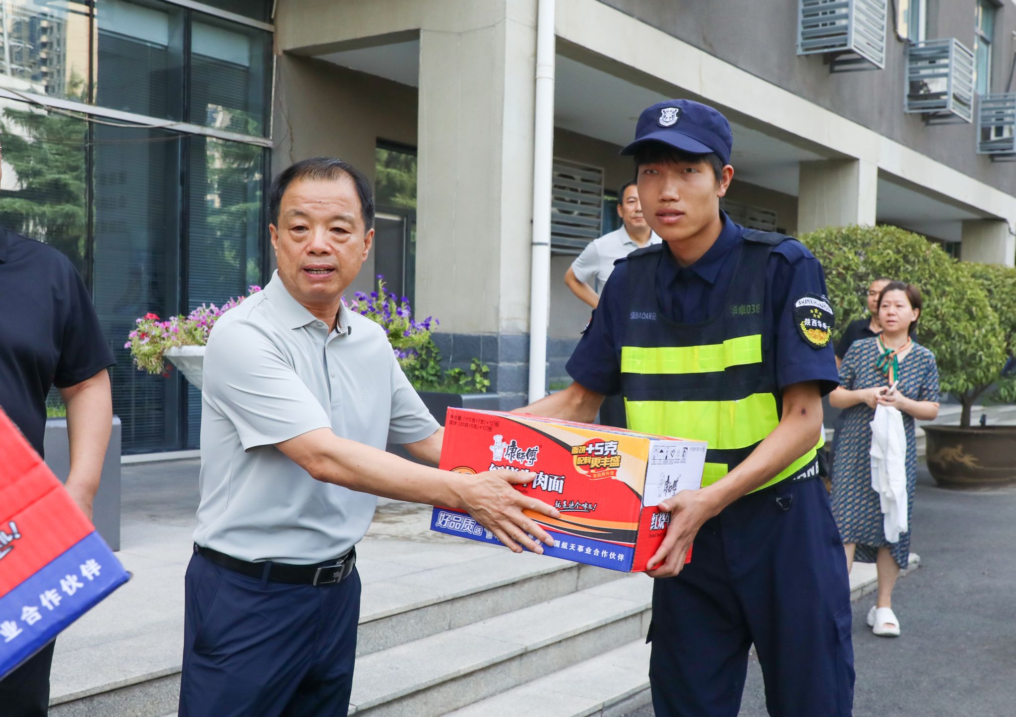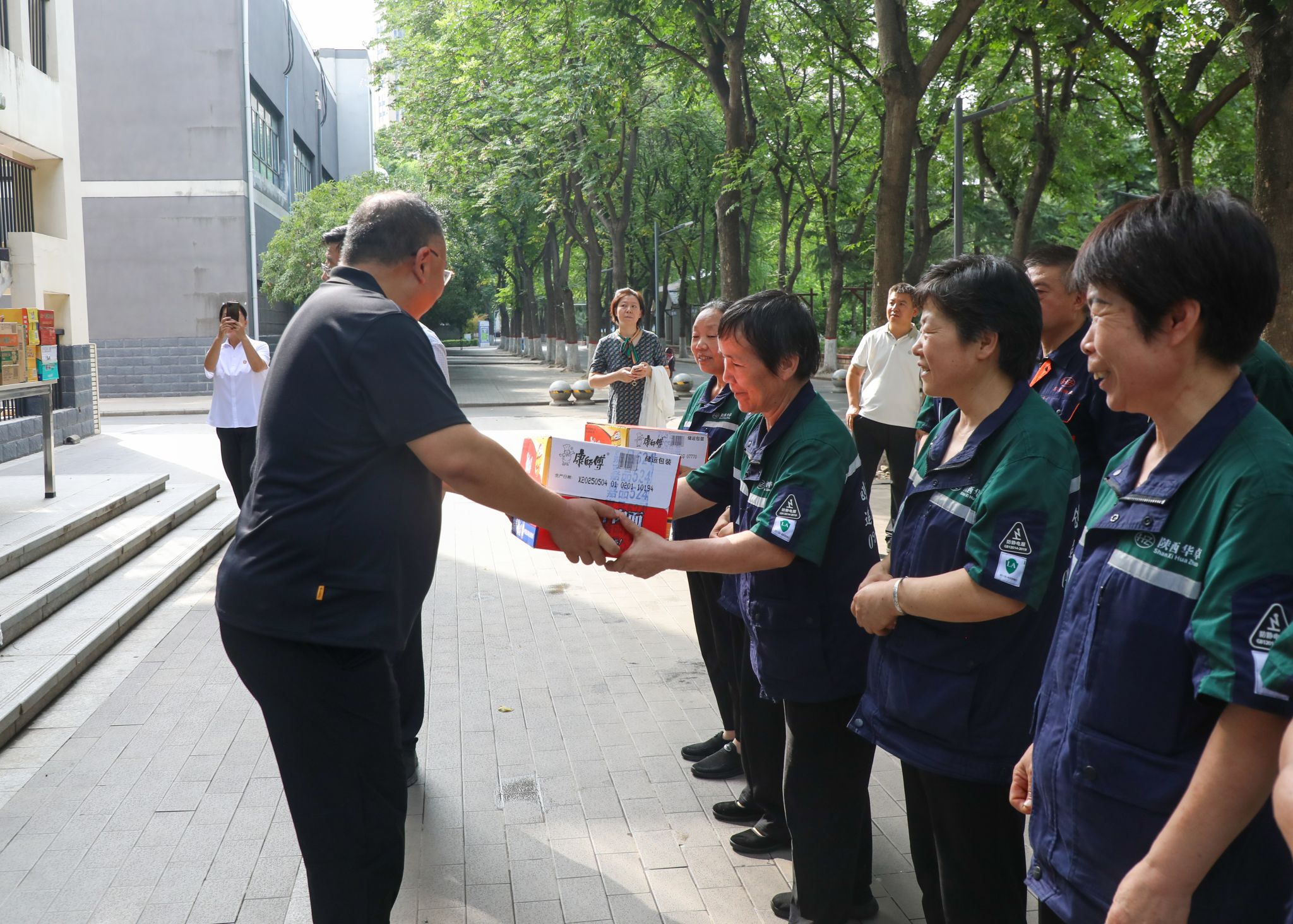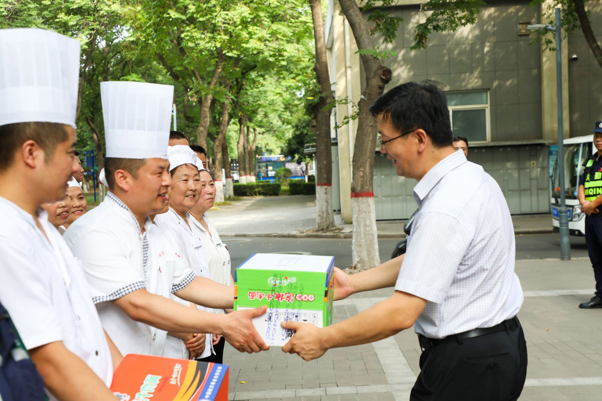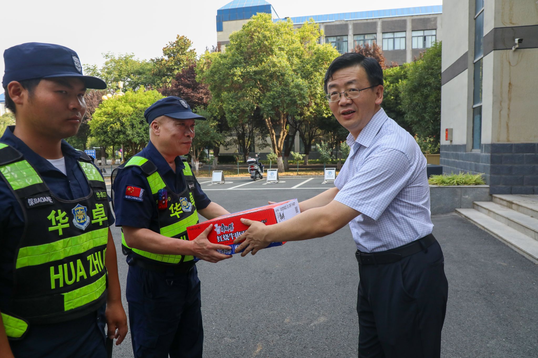 7月16日,西安持续高温,校党委书记王育选、副书记任晖,副校长、工会主席龚杰昌一行深入校园,慰问暑期坚守岗位的工作人员,并送去防暑降温品。