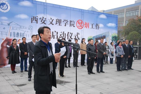 仪式上后勤管理处处长赵勇宣读了《西安文理学院禁烟工作实施方案》:从即日起,学校开展禁烟工作,实现全校所有室内学习和工作场所全面禁烟,努力创建无烟学校。教师代表和学生代表在仪式上分别进行了校园禁烟工作的表态发言和倡议宣读。
