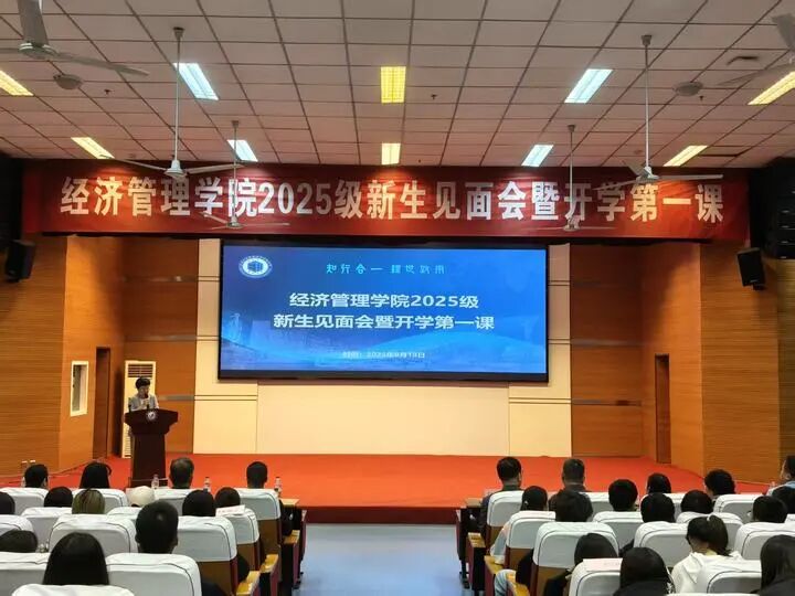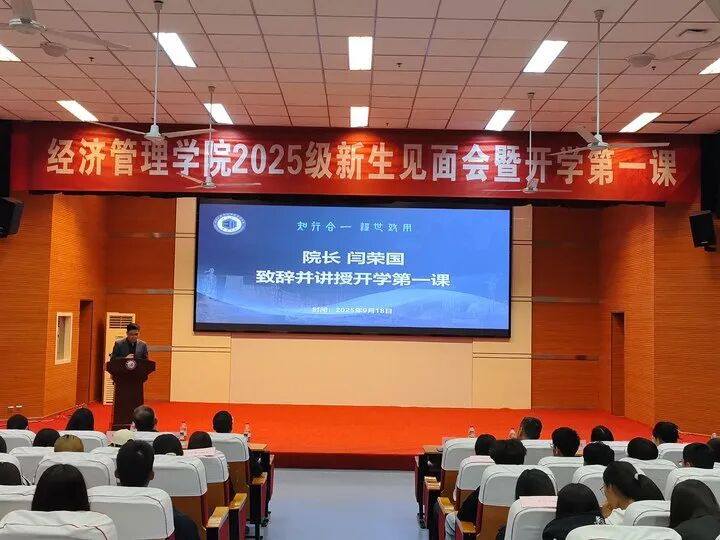 9 月 18 日晚 19:30,经济管理学院 2025 级新生见面会暨开学第一课在明德楼 A 区报告厅拉开帷幕。院领导班子、教师代表、学工办全体干部与 2025 级全体新生齐聚一堂,共同开启新生的大学成长新篇,会议由学工办主任胡欣主持。