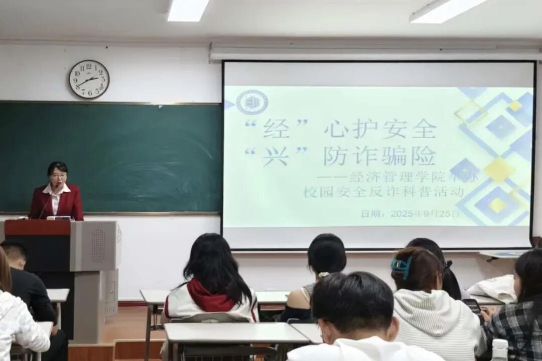 为切实提升学生安全意识与反诈能力,9月25日晚 7:30,经济管理学院联合兴业银行在弘文楼 H0113 教室举办校园国家安全反诈科普活动,各班班长、团支部书记、学习委员、生活委员及舍长共 70 余人参与本次活动。