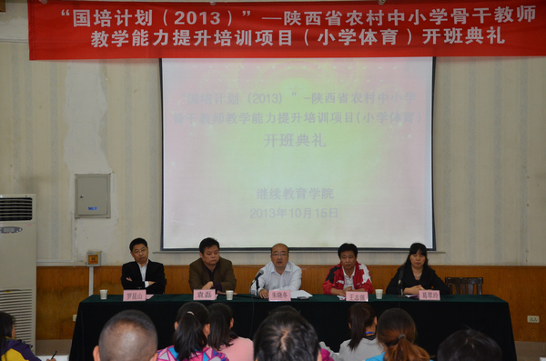 10月15日下午,我院和继续教育学院承担的 "国培计划(2013)"--陕西农村中小学骨干教师教学能力提升培训项目(小学体育)在书院校区举行了开班典礼,陕西省教育厅师资与师范教育处副处长朱晓冬,"国培计划"陕西省项目执行办项目主管罗昆山,继续教育学院、教育学院相关负责人及全体"国培计划"学员等参加了开班典礼。