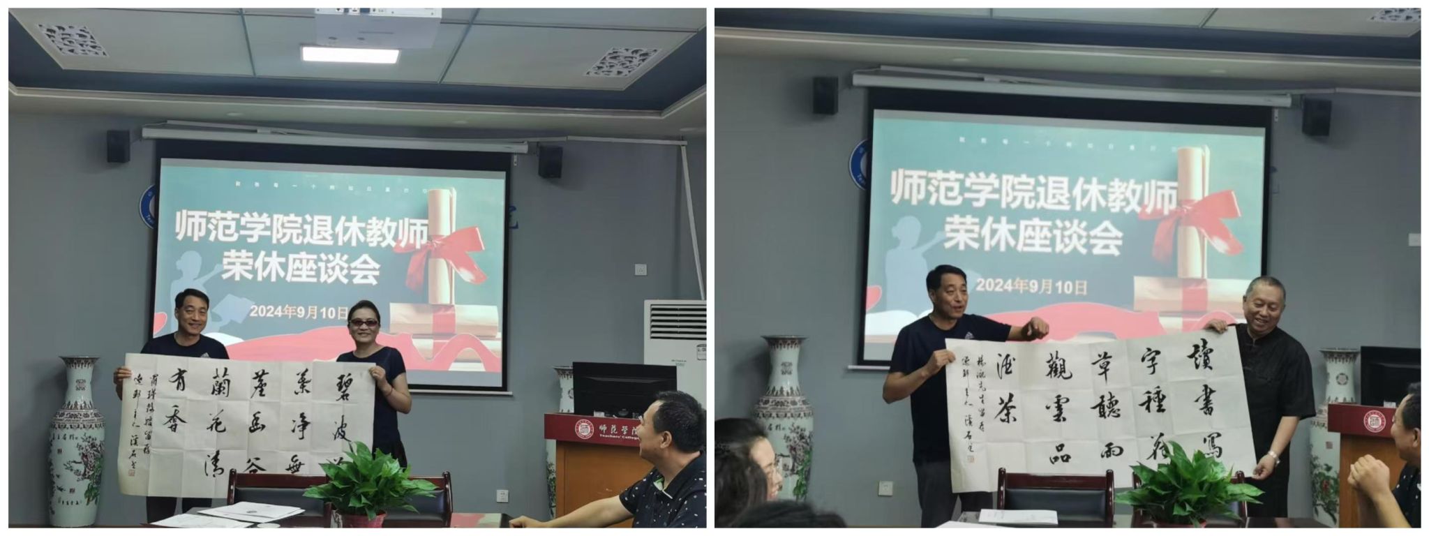 为营造更为温馨舒适的工作环境,丰富学院文化建设内涵,增强教职工的幸福感、获得感与凝聚力,在 9 月 10 日教师节当天,师范学院于明德楼 B0312 会议室为罗瑾副教授和杨泳副教授举办了荣休会,向为学院建设和发展作出突出贡献的两位老师致以崇高敬意,同时也为当天过生日的杨老师送上了诚挚的生日祝福。荣休会由院长曹莹主持。