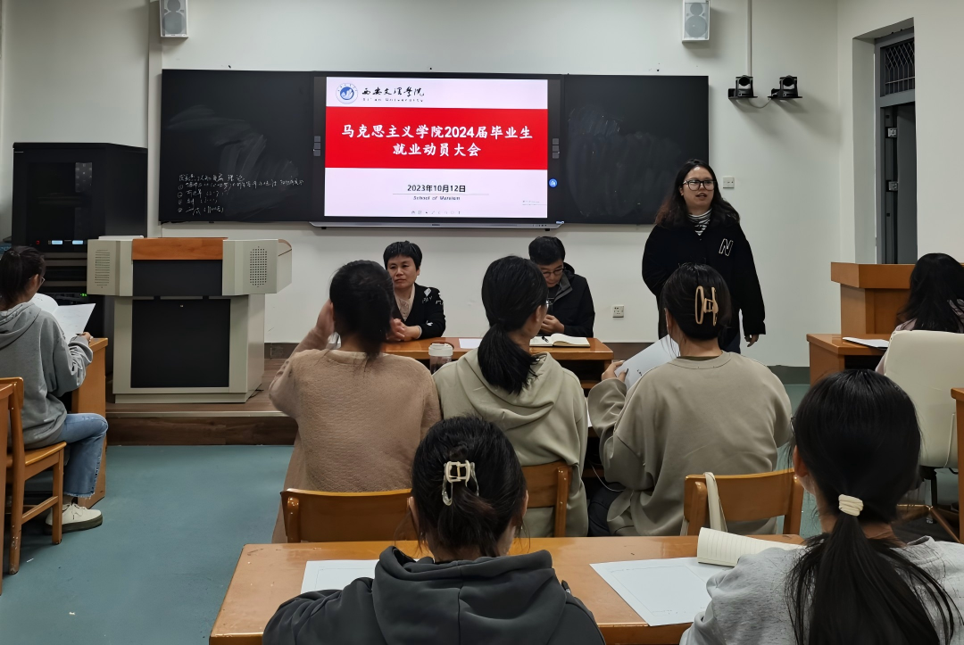 为推进2024届毕业生的就业指导工作,为毕业生提供更好的就业指导服务,切实落实推进就业相关工作,马克思主义学院于2023年10月12日19:00,在H0354 召开2024届毕业生就业动员大会。动员会由辅导员王晓佳主持,马克思主义学院党总支书记刘永平和院长刘维春以及2024届全体毕业生共同参会。