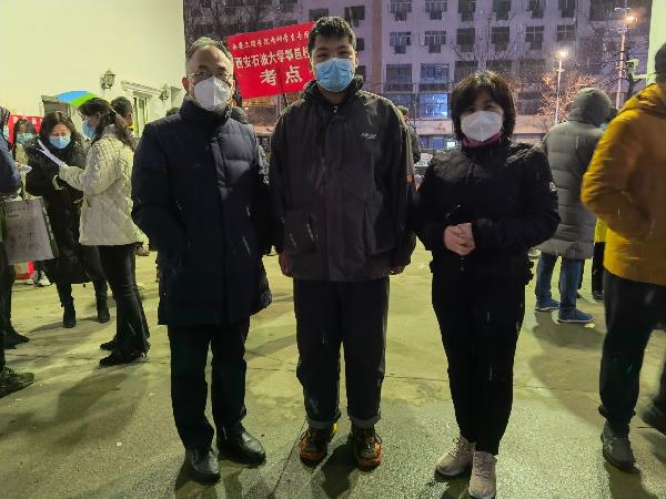 七天中的每一件事、每一个环节都在紧张而有序的进行着:钱院长在每天的两次专班会上都会强调再强调“防疫工作决不可大意”,她对每一个防疫点可能会出现的问题都会进行科学的研判,提前做出部署安排。25日、26日早五点,在学校北门口,一定能看到张书记、刘副院长的身影,他们会一一叮嘱考研学生注意安全防护,并送上他们的祝福。王舵老师一方面安排教育教学工作顺利进行,一方面忙着临时招募监考工作。学工办主任张思佳,人在学校南边管控区,心却被北边生活区学生们牵动着,随时都在处理、统计、上报各种数据。在学院21日招募志愿者时,陈勇老师放下家里只有七岁的孩子,第一时间报名进驻到专班工作,哪里需要哪里就有他的身影,他舍小家为大家、关键时刻冲在前,支部书记的先锋模范行为得到了全院教职工的点赞。24日晚,王舵老师,陈勇老师和魏娟辉老师的爱人分别将最后几个考研学生送达预定酒店,回到家已经凌晨三点。办公室主任慕小宇老师虽被封在小区内,但未雨绸缪早早就备齐了防疫物资……所有的一切都是为了保证同学们安全、安心。截止2021年12月26日晚十点钟,学院防疫专班通报:全院校内师生全部完成第四次核酸检测,结果全部为阴性,校外所有教职工包括同住家属均已完成第四次核酸检测全部为阴性。22名考研学生全部于12月26日晚八点前平安返回,学院同时对22名学生按照提前研判的预案进行直接隔离,由学院志愿者每日送餐送水,保证同学们的生活学习。本周开始教学口会继续安排学生完成所有科目的学习、复习和考试,同时邀请专家线上为同学们有针对性的进行英语四六级、考研的培训报告,一方面封校不停学,一方面缓解同学们的心理压力。