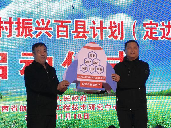 11月18日,航天农业乡村振兴百县计划第一站在陕西省榆林市定边县正式启动。中共榆林市委常委、榆林军分区政委赵西月,定边县委书记胡统金,县长苗玉祥,西安文理学院党委委员、宣传部长、生物与环境工程学院院长鲍锋,副院长张九东,陕西省航天育种工程技术研究中心主任郭锐、副主任袁国骏等领导、嘉宾、企业界代表及定边县机关干部等,共同见证了启动仪式。