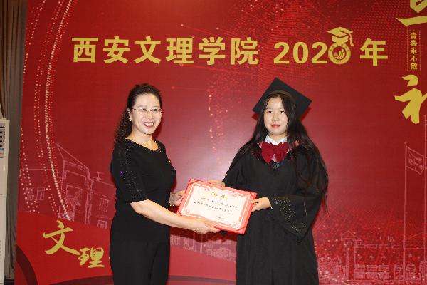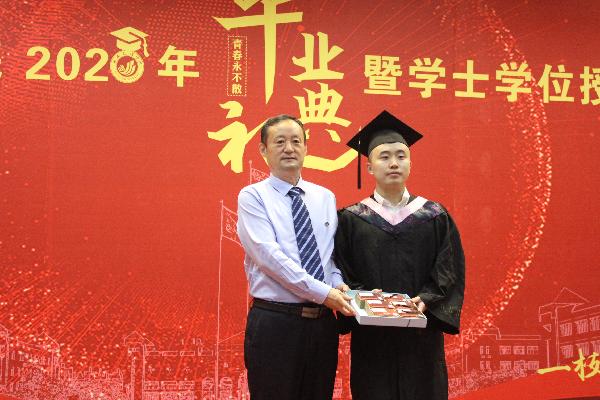 典礼上,院长韩红建教授致辞讲话,他从平和心态、厚道做人、心怀梦想三方面鼓励毕业生,要懂得珍惜生命,心存感恩,心怀对国家和民族的自豪与自信,以持之以恒的坚持、心存梦想砥砺前行;书记王克盈宣读了《关于对2020届优秀毕业生的表彰决定》并为获奖学生颁奖;副院长杨红梅宣读了《关于对2020届考取研究生学生的表彰决定》,本年度学院共有26名学生考取了美国南卡莱罗纳、北京第二外国语学院等国内外知名学校的研究生;教师代表王华发言对毕业生提出了不忘初心、追求卓越、奋发有为的要求,表达了对他们前程似锦、未来可期的美好希望;学生发言表达了对母校以及老师的真挚感情和深深的眷恋;组织委员刘军辉为 毕业生赠送了蓝田玉篆刻的精美签章纪念品;毕业生向全体教师献花,表达谢意。