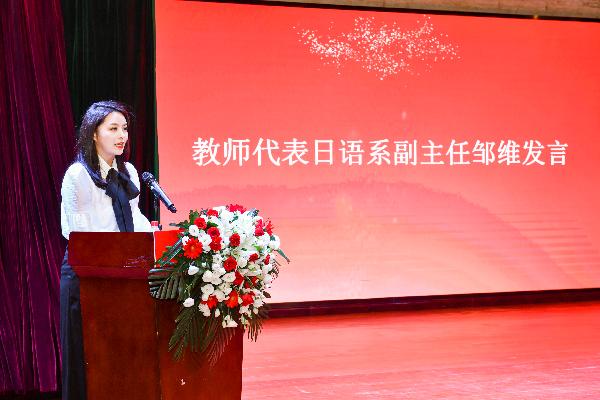 教师代表日语系副主任邹维副教授发言。她以前辈之名,鼓励同学们莫把成功当成人生的终极目标,强调诚实、正直、宽容、勇气,才是终身所求,要始终保持谦虚和好学,立长志、为一生、求真爱、付真情。优秀毕业生代表2019级英语专业董蕊同学发言,表达了对母校深深的眷恋和诚挚的祝福。考研之星代表2019级日语专业朱佳昂同学发言分享了自己考研的心路历程,学会享受孤独、不要假装努力,步子要稳,心态要好,才能在考研路上行稳致远。