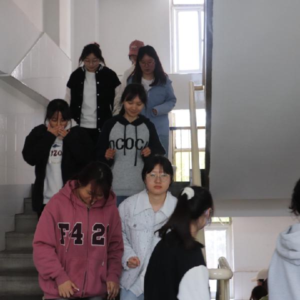 仪式过后,我院开展了学生宿舍地震火灾疏散演练。一切准备就绪后,警报声响起,宿舍内的学生按照规定的路线,弯着腰、捂住口鼻,迅速撤离现场。在各楼道口安全员的指挥下,有序、快速地撤到指定的安全地点集合,达到了预期效果。