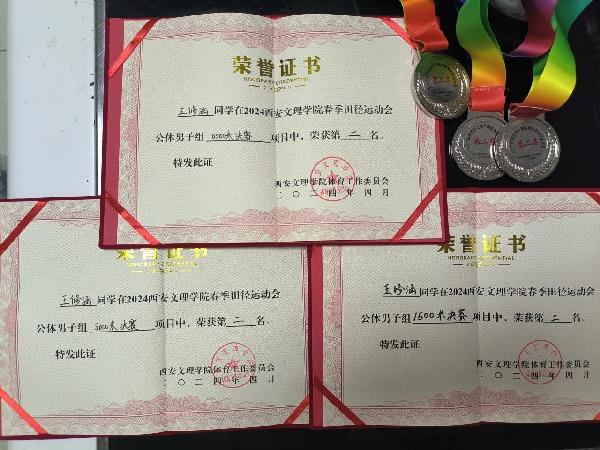 2303班王修涵在2024西安文理学院春季田径运动会中荣获公体男子组10000米,公体男子组5000米,公体男子组1500米三项比赛的银牌。