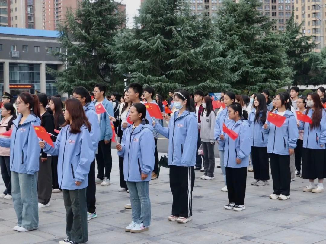 在国庆清晨的阳光下,学生代表参与了升国旗仪式。伴随着激昂的国歌,五星红旗缓缓升起,鲜艳的红色在阳光照耀下愈加夺目。全场同学肃立行注目礼,心中涌动着对祖国的深情与祝福。