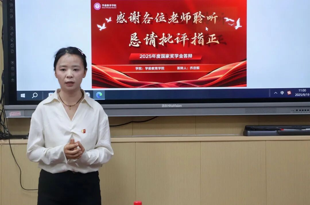 为进一步落实国家奖学金评审工作的“公开、公平、公正”原则,全面展现学前教育学院优秀学子的风采,充分发挥榜样示范引领作用,9月19日上午,学前教育学院召开2025年度国家奖学金院内联合评审会。经过前期政策宣传、学生自愿申请、调查了解、学院初审及材料公示等环节严格遴选,共有6名优秀学生入围本次联评,其中1人因个人原因自愿放弃参评资格,最终5名候选人参与现场展示答辩。
