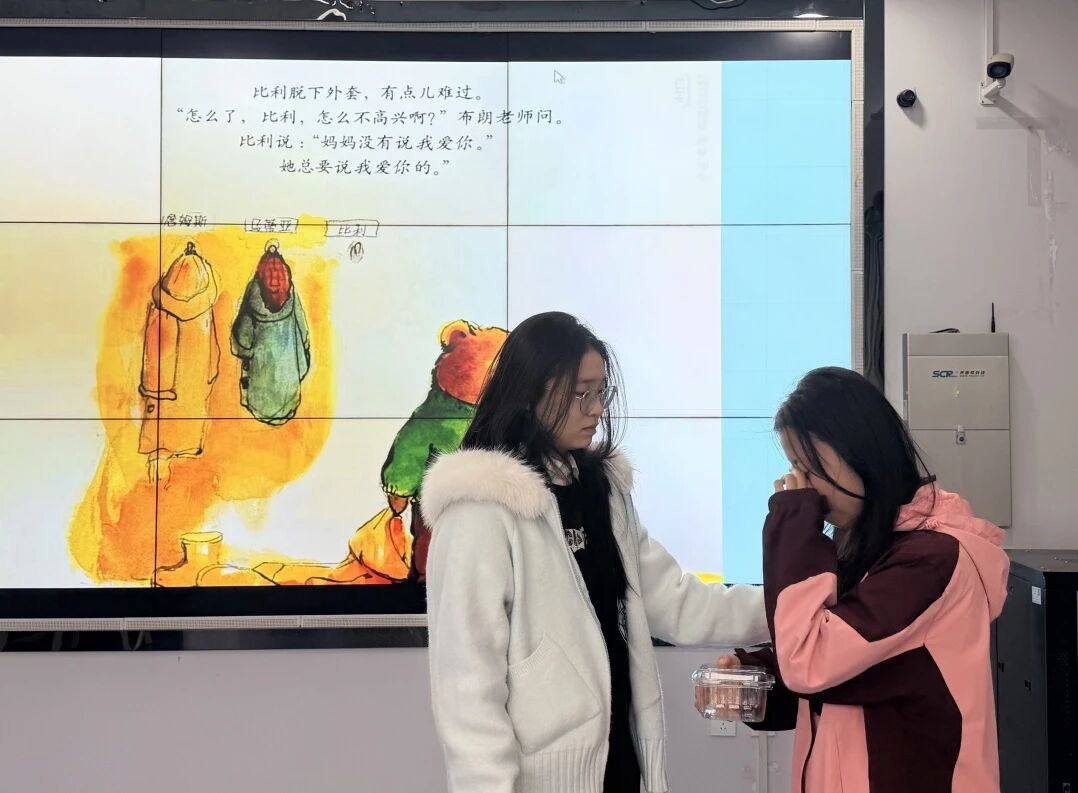 随后,加洁幸、王书悦、李宇星、袁心如四位主讲人联袂登场,以经典绘本《忘了说我爱你》为蓝本,带来了一场沉浸式的情景演绎。她们用生动的角色扮演、绘声绘色的讲述,让同学们仿佛置身故事现场,跟着比利的小情绪起伏,一起分析他拖延行为背后的幼儿心理小秘密。互动环节中,主讲人讲解了一系列由绘本引出的问题,在思维碰撞中逐步拆解了幼儿拖延行为背后的心理需求。