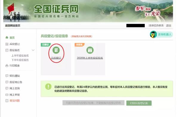 采取网上登记方式进行,直接登录全国征兵网(网址:http://www.gfbzb.gov.cn/ )进行兵役登记。