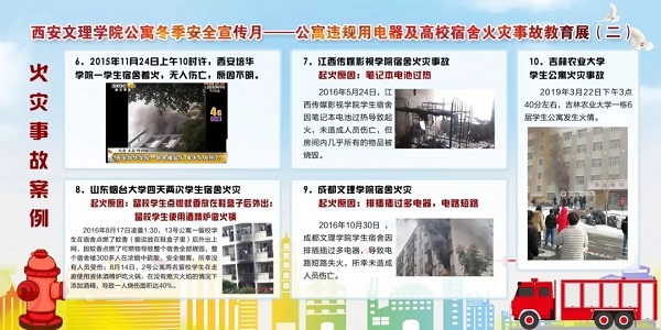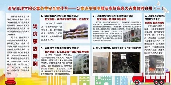 4、举办学生公寓内违规用电器实物展及10所高校学生宿舍火灾事故警示教育展。