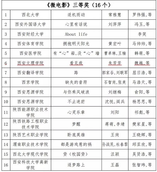 12月11日,省高校心理素质教育研究会公布了“关于表彰第四届陕西省高校心理育人百家慕课学生作品获奖优秀成果的通报”,我校共推荐6部作品均获奖项。