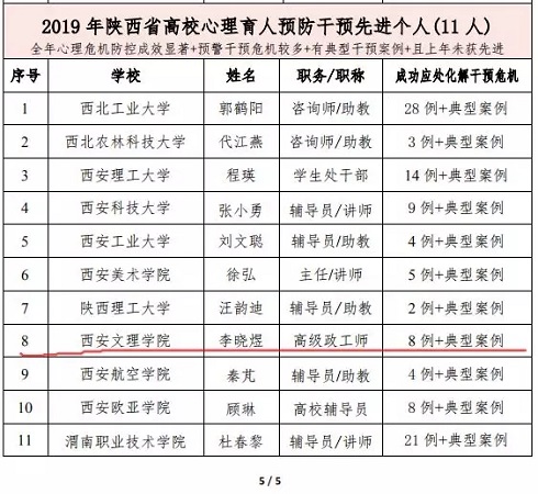 12月16日,“2019年陕西省高校心理育人先进集体和先进个人评选”落下帷幕。省高校心理研究会组织专家通过初选复议、终评推选,共评选出5个全省高校心理育人社会贡献单位、12个心理育人工作先进集体、22个心理育人宣传实践模范单位、10名最美心灵卫士、14名心理教学先进个人、20名心理实践先进个人、10名心理咨询先进个人、11名心理预防先进个人。其中,我校心理中心获得心理育人先进集体、心理育人宣传实践模范单位,我校心理中心副主任韩海燕、心理中心兼职咨询师李晓煜分别获得心理育人实践活动先进个人、心理育人预防干预先进个人。