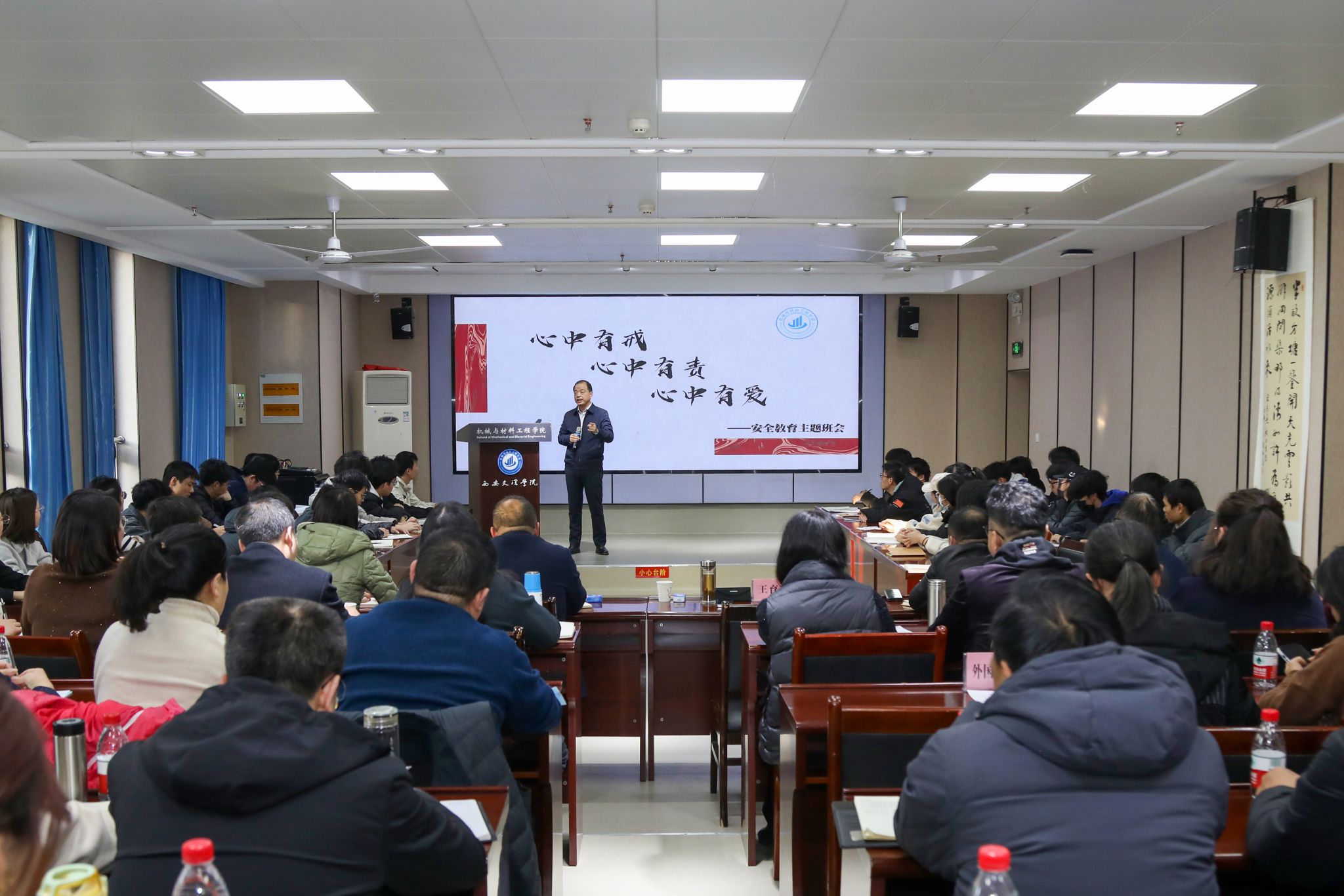 校党委书记王育选、副校长任晖深入机械与材料工程学院参加“心中有戒,心中有责,心中有爱”主题班会,党政办机关党总支学生处团委等职能部门负责人,各二级学院党总支书记、材料学2301班全体学生共同参会。辅导员魏侨从假期安全切入,从虚假网络信息和网络舆情带来的危害深入,引导同学们要增强明辨是非的能力,强化安全意识,明大德、守公德、严私德。兼职班主任王小艳、辅导员张汝淼、张佳婧与同学们共探讨、共感悟,教育同学们要坚持实事求是、客观公正的处事原则,大力弘扬工匠精神和科学家精神,厚植爱国主义情怀班会既有知识讲授,也有畅谈理想信念、人生价值观等话题讨论,既有老师嘱托,也有班委倡议等学生互动,主题鲜明、内容丰富、形式多样。