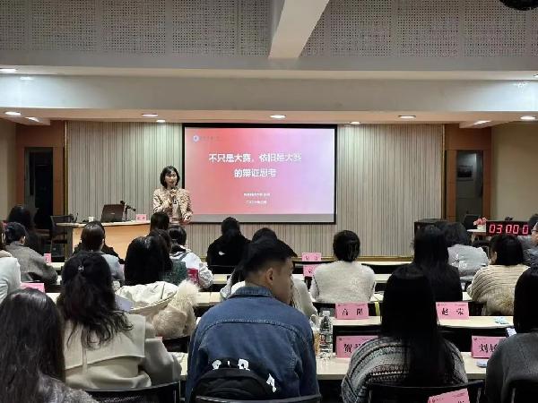 张杨老师以个人工作经历为切入点,与大家分享了与大赛从初识、赛道、机会、到回归的不解情缘。在第一篇章,她以“大学第一课”作为发展理念的铺陈起点、“生涯团辅”作为发展理念的生动呈现、“生涯跟踪档案”作为发展理念的落地生根、“发展类问题谈心谈话”作为发展理念的植入心田四个方面,分享了她自己的实际工作经验及参赛体会的心路历程,结合辅导员九大职责,引导大家如何以专业化为目标,寻找转动辅导员工作平衡轮的杠杆,希望大家用发展的理念促进工作落实突破。她强调,大赛是工作经验和思考的集中短时呈现,辅导员的光芒绽放,不只有大赛一个平台,我们有百花齐放的多平台发展机会,但一定是源于全方面的积累与提升,所以回归人才培养,回归立德树人工作,沉毅笃行,才能厚积薄发。