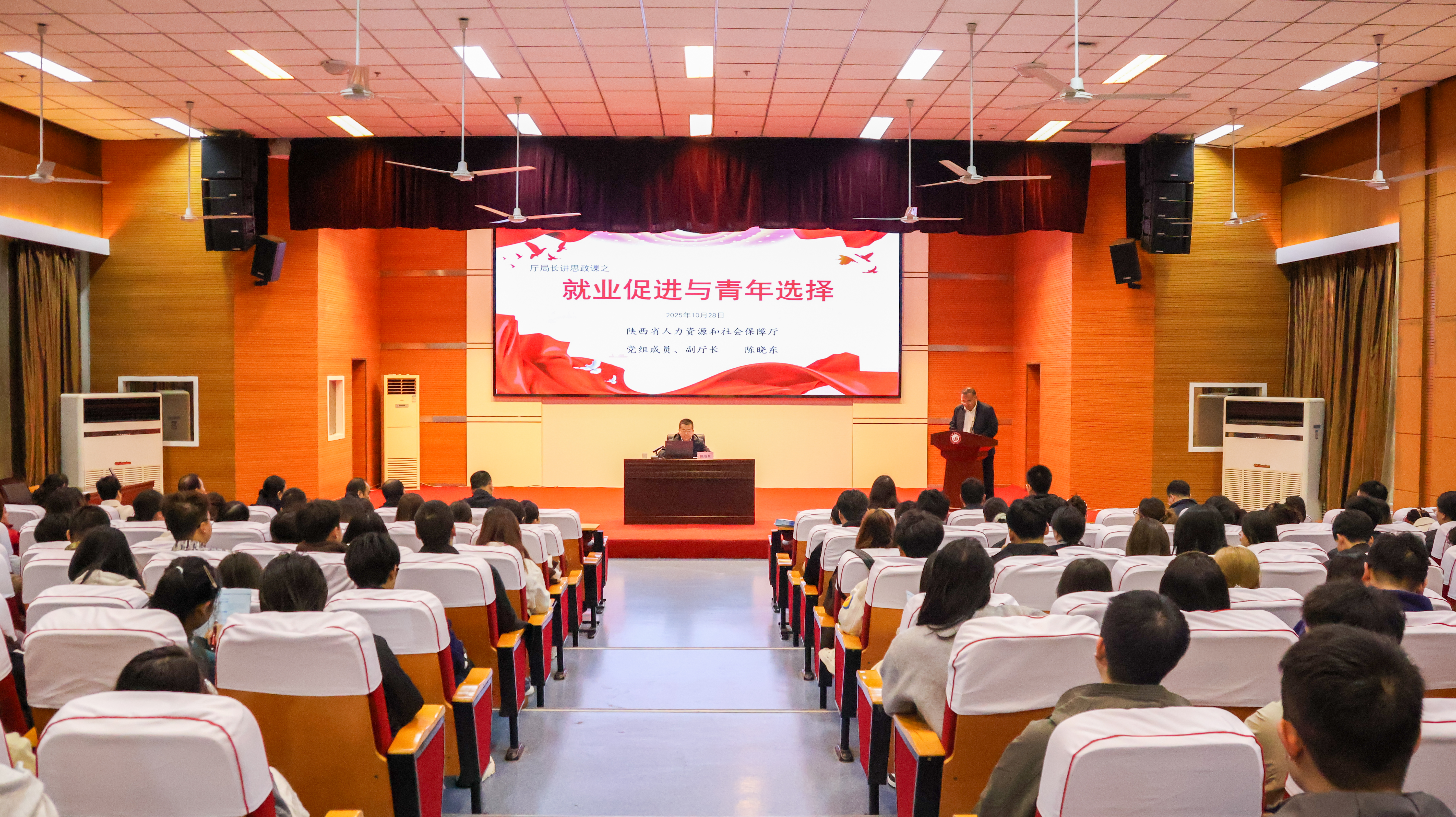 10月28日上午,陕西省人力资源与社会保障厅党组成员、副厅长陈晓东深入我校,为师生讲授思政课。陈晓东以《就业促进与青年选择》为题,从陕西省就业总体情况、高校毕业生就业形势、面对职场大学生该准备些什么三个方面,讲述了就业工作的使命任务、就业指标情况以及政府实施“一揽子”政策促进高校毕业生就业创业等内容,既有高屋建瓴的理论阐述,又有贴近实际的数据分析,让我校师生对当前的就业形势有了更加清晰的认识,对青年就业选择有了更加深刻的理解。...