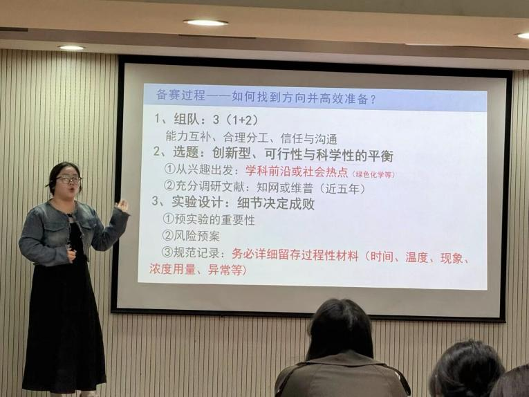 紧接着,拥有丰富参赛经验的雷晨璇、舒琳、姚梦悦三位同学分享了自己的实战心得。他们不仅讲述了自己在准备过程中的具体做法,如实验设计、材料选择等细节,还分享了许多宝贵经验,让在场的每位同学都感受到了满满的干货。