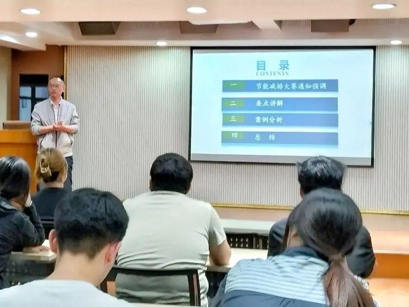 会议开始,张老师先向大家明确指出了节能减排大赛的核心要素,为学子们系统地梳理了竞赛的结构框架和规则要求。在要点阐释阶段,张老师依托其扎实的专业知识及丰富经验,对选题策略、技术方案设计以及实践操作的关键细节进行了精准剖析。
