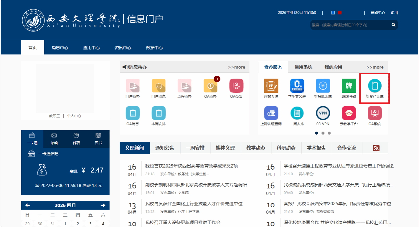2.在信息门户右侧“推荐服务”或“常用系统”中选择新资产系统即可使用。
