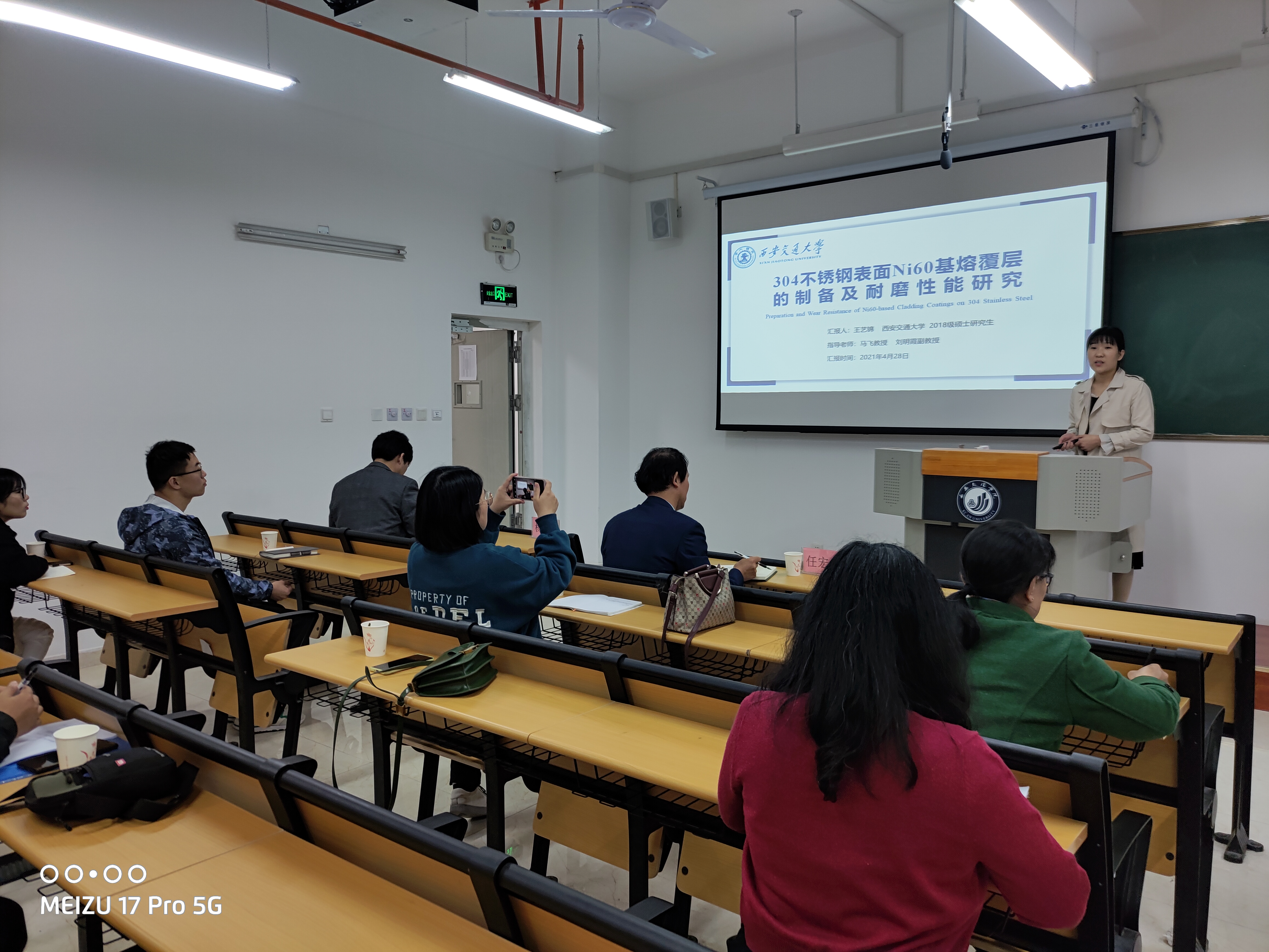 联合培养研究生王艺锦作了题目为“304不锈钢表面Ni60基熔覆层制备及耐磨性能研究”的学术报告,并汇报了近期的工作进展。该生的研究课题以陕西省表面工程与再制造重点实验室为依托平台,采用预置粉末法激光熔覆,以Ni60自熔性合金粉末为基础,通过调控激光输入能量、原位生成润滑减磨相以及颗粒强化相,调控熔覆层的微观结构,深入研究熔覆层组织结构与耐磨性之间的本征关系,揭示涂层磨损机理及微结构调控机制。汇报结束后,与会师生进行了热烈的学术交流探讨,合作导师刘明霞也进行了点评,认为该研究内容充实、研究成果颇丰,并对其在学习、工作中遇到的问题进行了解答,尤其是对如何深入进行科学研究、撰写论文进行了指导。