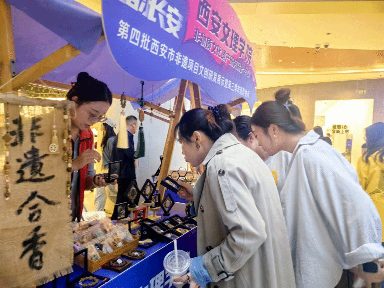 贺国庆、迎中秋之际。“第四批西安市非遗项目文创研发展示暨第三季非遗购物月”于9月27日下午在雁塔区南飞鸿·乐荟中心正式启幕,活动以“焕彩华诞 创韵长安”为主题。由西安市文化和旅游局主办,西安市非物质文化遗产保护中心等承办,西安市雁塔区文化馆、我校非物质文化遗产研究保护中心、南飞鸿乐荟中心等十多家单位协办。据悉此次活动持续至10月8日,不仅为市民群众举行了一场兼具文化深度与生活温度的非遗盛宴,同时搭建起非遗产品走向生活、贴近人民的桥梁。