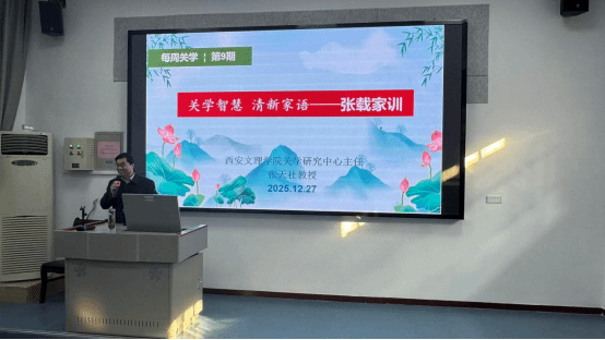 本次活动由西安文理学院关学研究中心主任张天社教授担任主讲人。作为关学研究领域的资深学者,张天社教授以通俗易懂的语言,从张载的生平事迹切入,结合《东铭》《西铭》中的经典家训内容,为孩子们拆解关学文化中“崇文重教、修身立德”的核心内涵,将抽象的传统文化理念转化为贴近少年认知的家风故事。课堂上,教授还通过互动提问的方式,引导学生思考“如何传承良好家风”,现场学生纷纷举手回应,将研学氛围推向高潮。