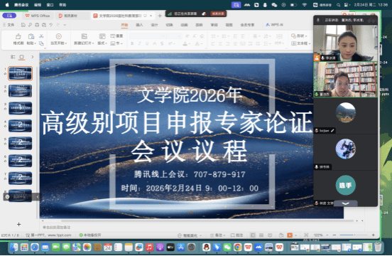 为进一步优化提升高级别项目申报质量,2月23日至24日,文学院举办寒假第二轮高级别项目线上专家论证会。黄忠廉、李西建、钟书林三位专家第二次受邀参与指导论证,学院申报团队成员参会,党总支委员李冰清主持。