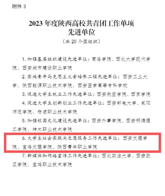 近日,共青团陕西省委、中共陕西省委教育工委联合印发《关于2023年度陕西高校共青团工作述职评议结果的通报》,我校荣获“大学生社会实践与志愿服务工作先进单位”;校党委书记王育选荣获“支持共青团工作好书记”;校团委副书记钱尹璐荣获“共青团工作先进个人”。