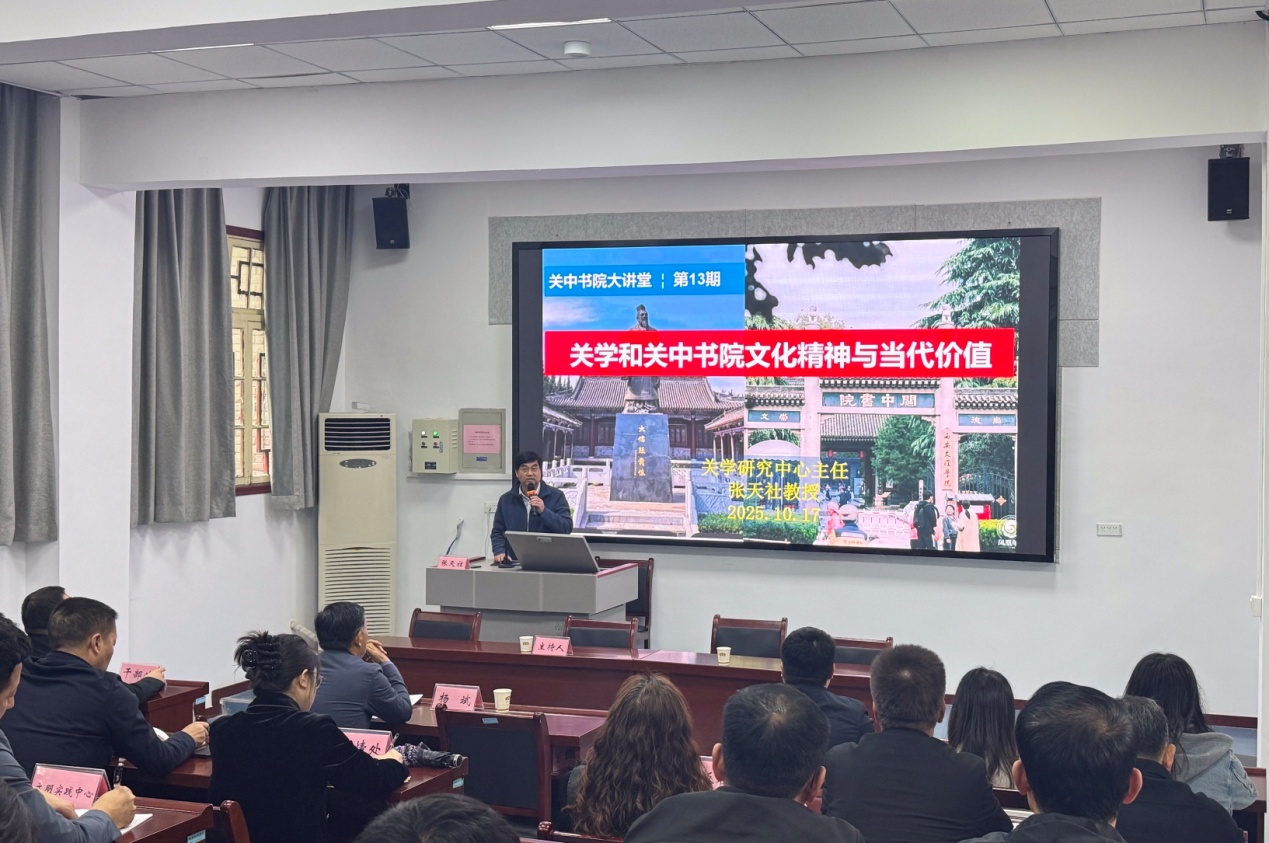 10月17日下午,我校“关中书院大讲堂”第13讲在关中书院西铭院举行,西安市委宣传部干部70余人参加。本次“大讲堂”由西安市委理论讲师团团长杨斌主持,我校关中书院关学研究中心主任张天社教授主讲。