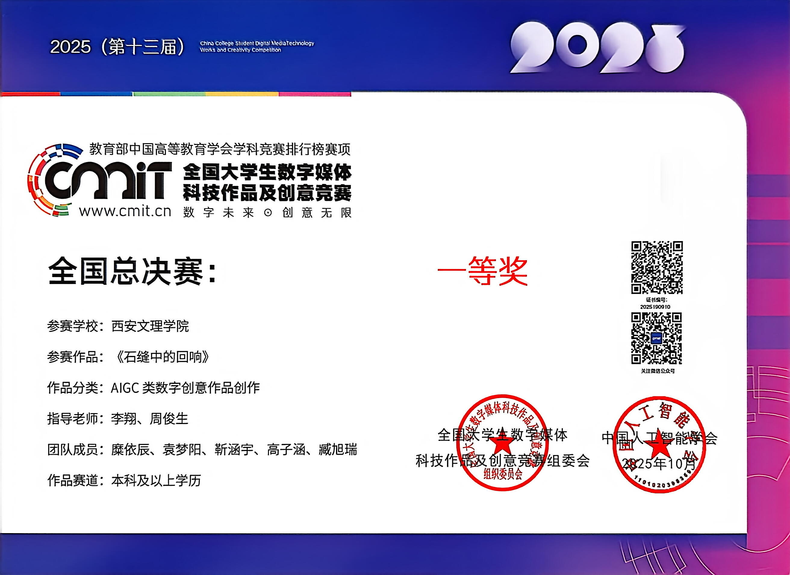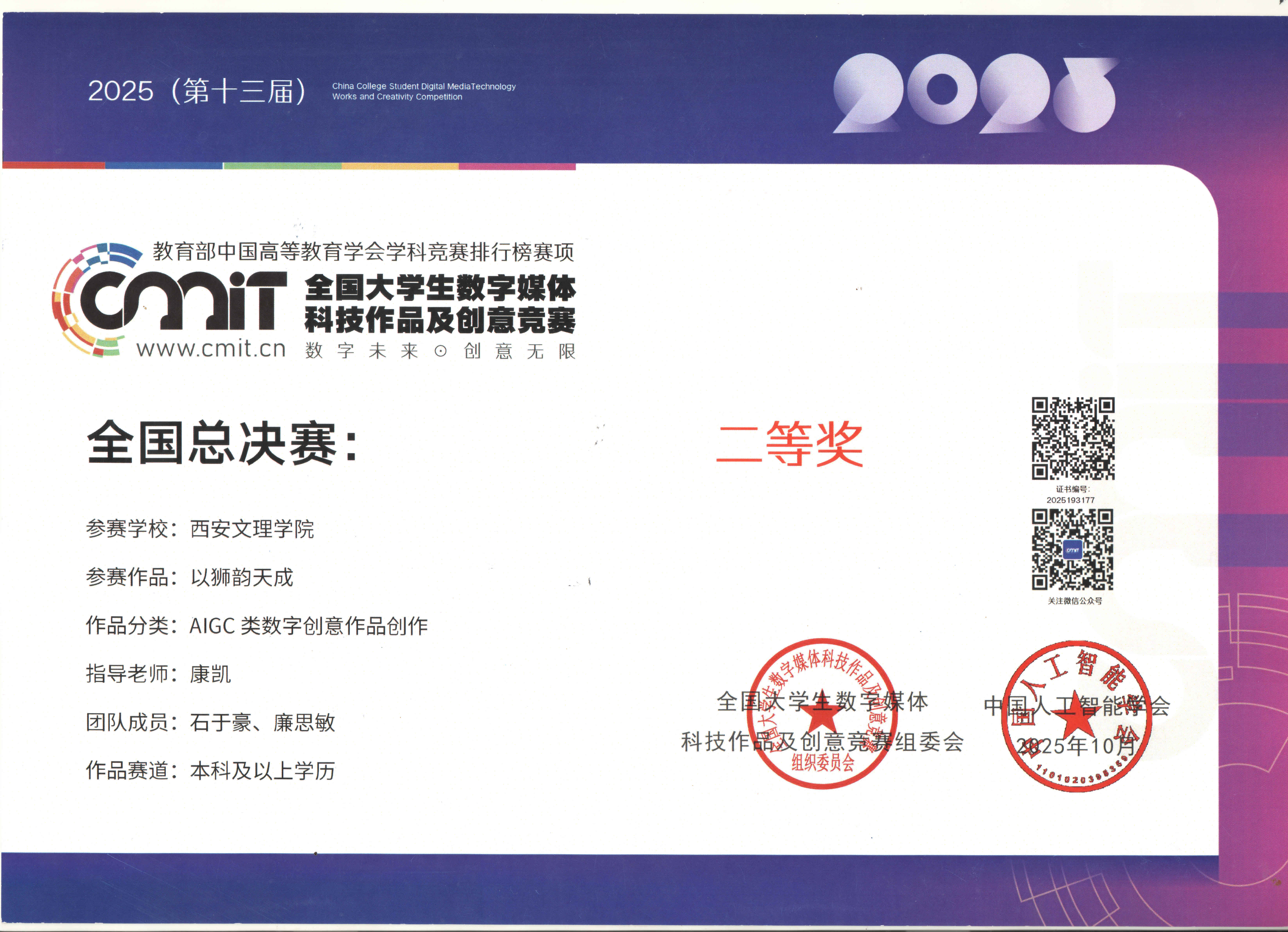 此次全国大学生数字媒体科技作品及创意竞赛是在全面贯彻落实党的二十大精神,推进“教育强国、科技强国、人才强国”战略背景下举办的全国性高水平学科竞赛,吸引了全国众多高校师生的积极参与。美术与设计学院获奖师生立足自身学科特色,将教师科研项目、教改与专业教学深度融合,通过创新实践教学将地域文化与专业知识深度融合:依托“走读秦岭”项目,以数字技术创新展现本土文化魅力;结合省级创新创业在线开放课程《产品开发设计》钻研陕西地域优秀传统文化元素,运用动态影像、AIGC等手法实现文化表达的当代转化;基于“AIGC与非遗传承”等研究方向,引导学生关注社会现实问题,运用数字艺术语言传递人文关怀。参赛作品既展现了我校学子扎实的专业能力,也体现了“以创促学、以美育人”的教学理念。