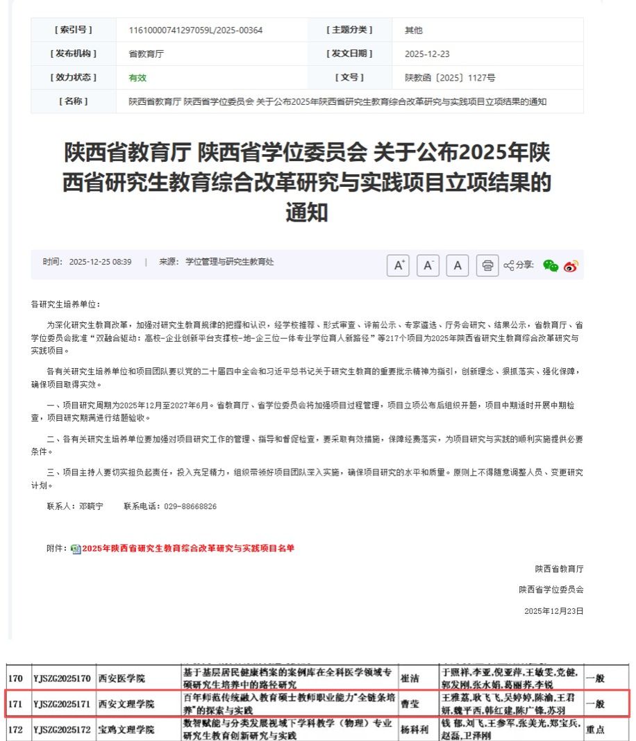 近日,陕西省教育厅公布了2025年研究生教育综合改革研究与实践项目名单,我校申报的“百年师范传统融入教育硕士教师职业能力全链条培养的探索与实践”项目成功获批省级研究生教育教学改革研究项目立项。这是学校首次获得该类项目立项,彰显了学校深厚的师范教育底蕴,也是学校积极推进研究生教育内涵式发展的切实举措。