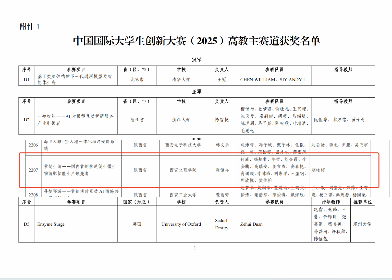 近日,教育部公布了中国国际大学生创新大赛(2025)获奖名单,我校生物与环境工程学院赵咏梅教授指导的参赛项目《紫韵生菌——国内首创抗逆促生微生物菌肥智能生产领先者》(项目负责人:周傲冉)凭借其突出的创新性、扎实的技术功底和广阔的应用前景,从全国众多优秀项目中脱颖而出,成功荣获国家级铜奖,这是我校在该项赛事中取得的第三个国家级奖项。