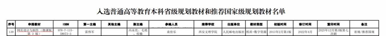 近日,陕西省教育厅公布入选省级规划教材名单,信息工程学院教师撰写的《网页设计与制作 微课版第3版》入选陕西省普通高等教育本科规划教材,同时被推荐国家级规划教材。