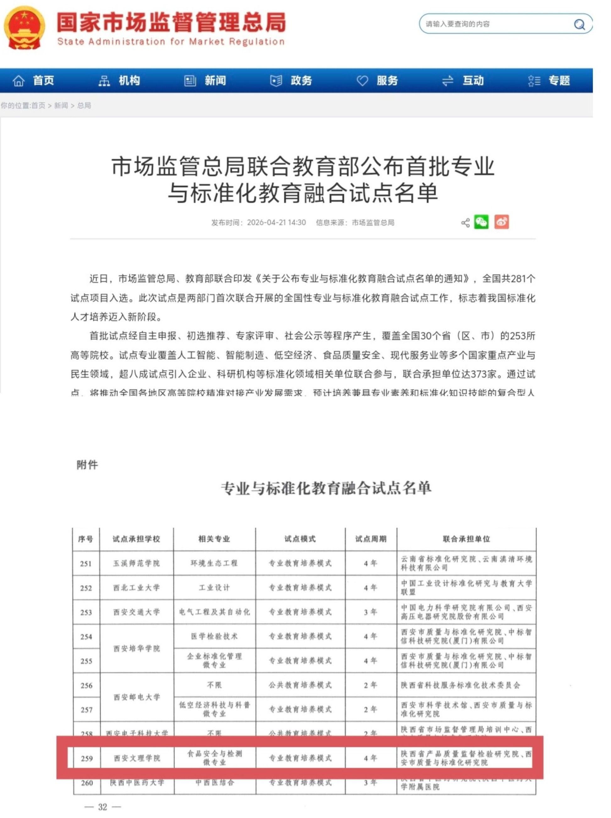近日,市场监管总局、教育部联合印发《关于公布专业与标准化教育融合试点名单的通知》,全国共有281个试点项目成功入选。其中,由我校牵头,陕西省产品质量监督检验研究院、西安市质量与标准化研究院共同申报的食品安全与检测微专业,成功获批国家级专业与标准化教育融合试点项目,标志着我校在专业建设与标准化教育融合领域迈入国家级试点行列。