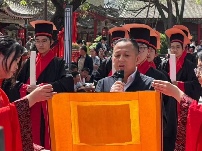 本次大典核心仪程为“三献礼”。依古代祭孔规制,先行“初献礼”,主祭官沐手,带领众人敬献帛、爵,随后康辉恭读祝文,追述孔子垂宪万世的功绩,表达当代书院继承道统、弘扬儒学的坚定决心。其后行“亚献礼”,执事官献爵于孔子像前,以示礼敬。“终献礼”毕,三献之礼完成。