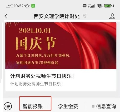 1.关注“西安文理学院计财处”公众号,点击左下角“智能报账”即可登录