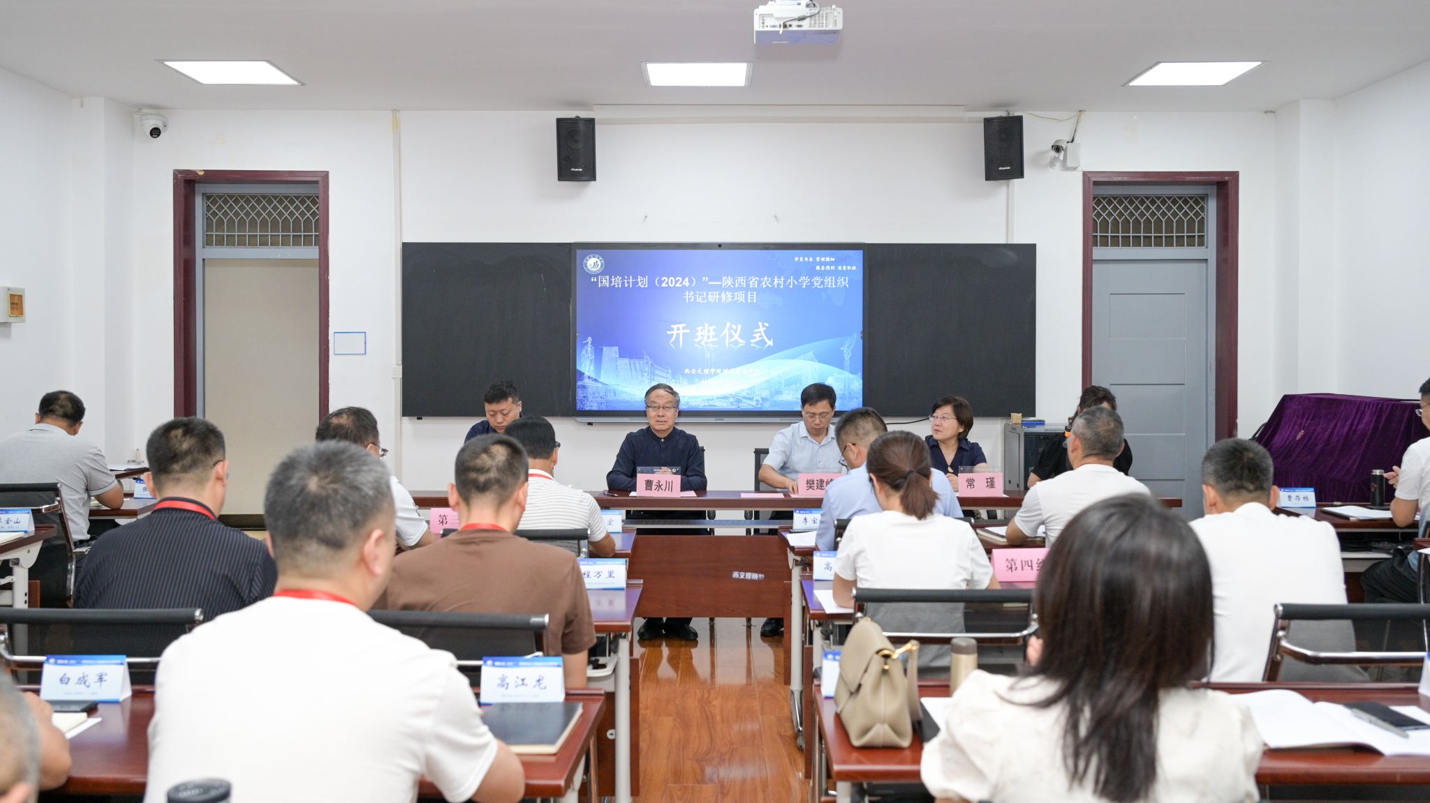 2024年9月20日上午,由我校承办的“国培计划(2024)”——陕西省农村小学党组织书记研修项目开班,并在太白校区举行了开班仪式。原西安市新城区教师进修学校校长曹永川、西安文理学院继续教育学院书记樊建峰、西安文理学院继续教育学院副院长常瑾、西安文理学院继续教育学院培训科科长乔育盟,以及来自全省各市县的40余名小学党组织书记、项目组全体成员参加了开班仪式。仪式由培训科科长乔育盟主持。