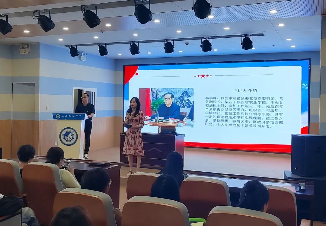 为深入学习贯彻习近平总书记关于党纪学习教育的重要讲话精神和重要指示精神,文学院党总支联合音乐学院、历史文化旅游学院、经济管理学院、外国语学院,于5月22日下午在明德楼c0415召开“强党性 守党纪 善修身”党纪学习教育专题党课。本次党课由西安市鄠邑区党校党委书记、常务副校长李攀峰主讲,文学院党总支书记李莎莎主持,教师、学生党员代表共计120人参会。