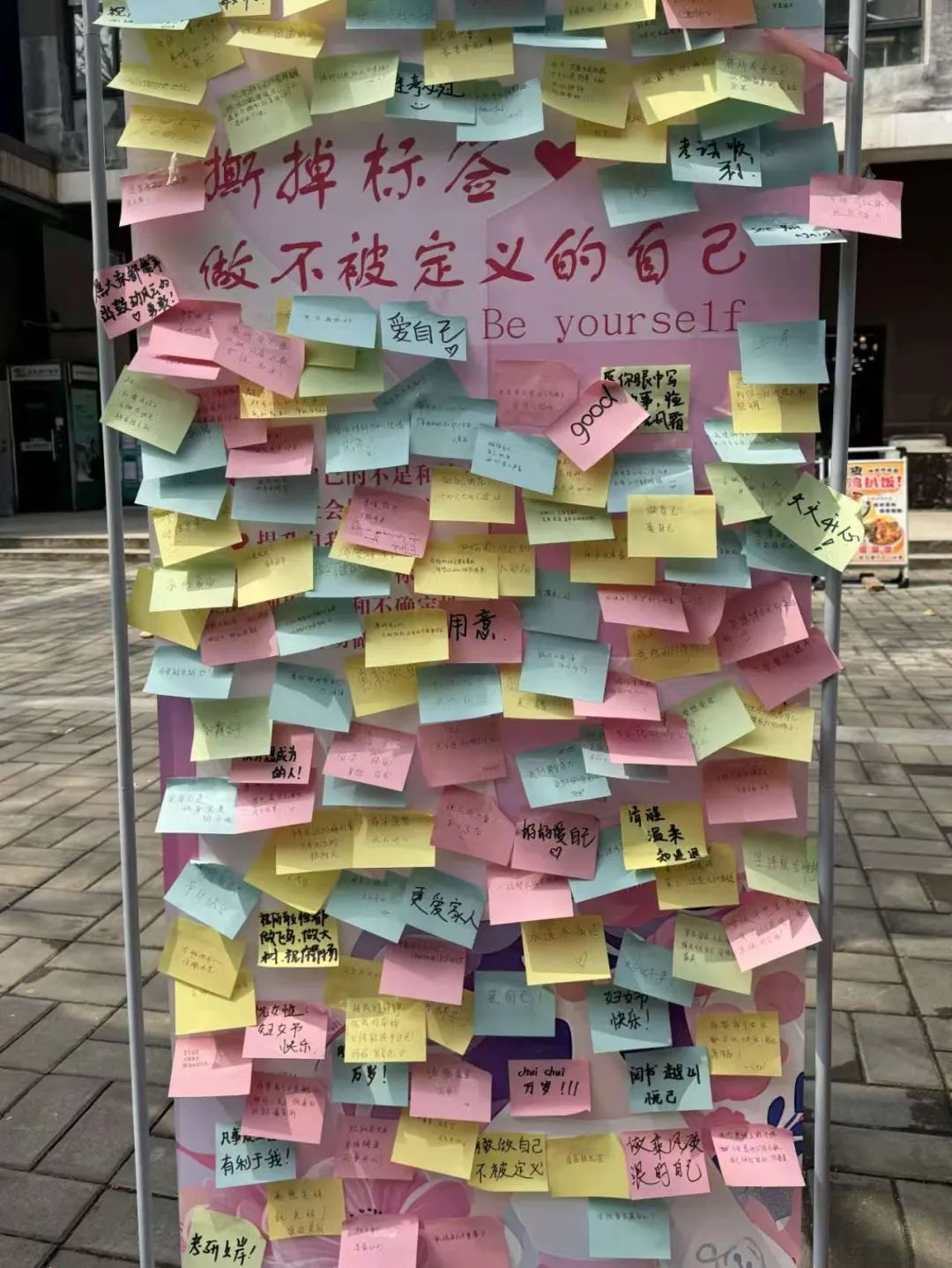 活动中,不少同学也纷纷主动积极发表了自己的想法:音乐学院的董逸嘉、唐鹤文同学表示:“我们认为经济管理学院的同学们举办的“不被定义的自己”这个活动是非常有意义的,当我们撕下标签的时候就像是撕掉了被加在自己身上的标签,那一瞬间我们是自信的!再次贴上祝福的话语,是鼓励大家,也是鼓励我们自己,可以让我们变得更加自信。”