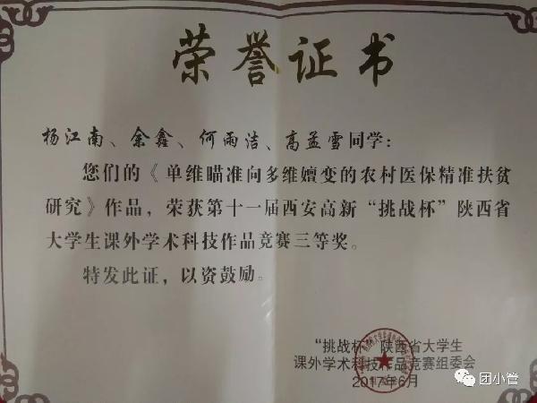 2017年6月获得“大学生挑战杯学术科技作品竞赛陕西省三等奖”