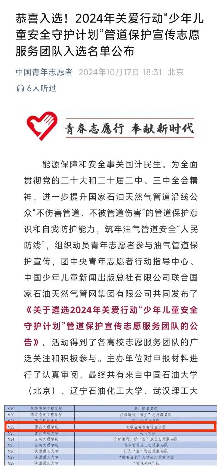 近日,团中央青年志愿者行动指导中心、中国少年儿童新闻出版总社有限公司联合国家石油天然气管网集团有限公司共同发布《关于遴选2024年关爱行动“少年儿童安全守护计划”管道保护宣传志愿服务团队的公告》,我校机械与材料工程学院大学生青言青语宣讲团成功入选1000支志愿服务团队!