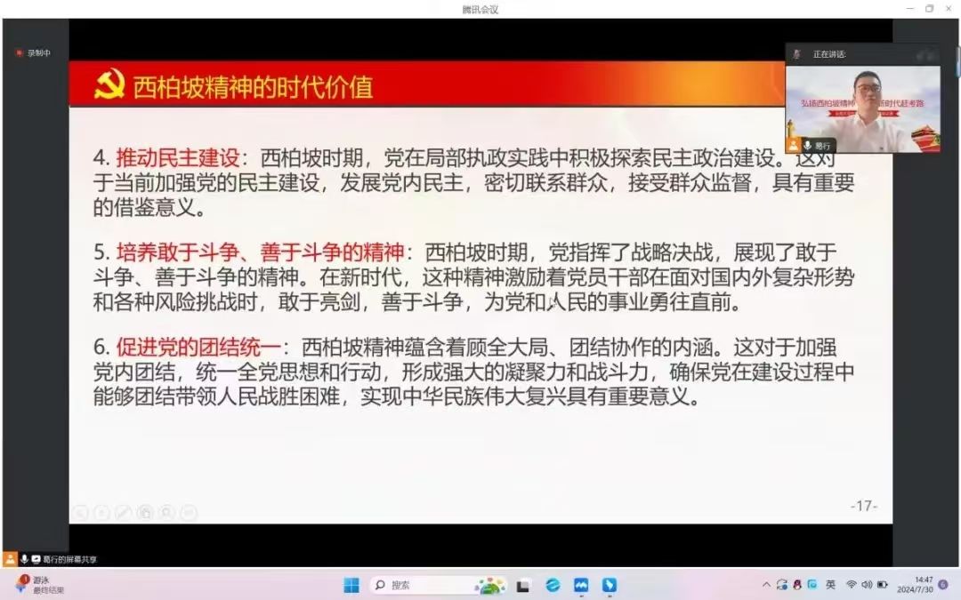 为学习贯彻落实党的二十届三中全会精神,激发学生党员进一步全面深化改革、推进中国式现代化的决心和毅力,7月30日,青言青语宣讲团面向智感机器人师生党支部的全体学生党员开展西柏坡精神宣讲暨党小组专题活动。活动由学生党员陈大嶶组织,学生党员、宣讲团成员葛行主讲,教师党员张佳婧主持。西柏坡精神是在伟大的革命实践中凝结而成的,对当下仍然具有重大而深远的意义。葛行同志以细致讲解和积极互动的方式,带领大家走进了西柏坡那段波澜壮阔的历史。他结合我们当前进一步全面深化改革、推进中国式现代化的任务,多角度、全方位地进行讲述了西柏坡精神的形成背景、内涵、时代价值以及西柏坡地方特色。在他的精心讲述下,西柏坡故事变得鲜活而生动,让党员同志们深受触动。
