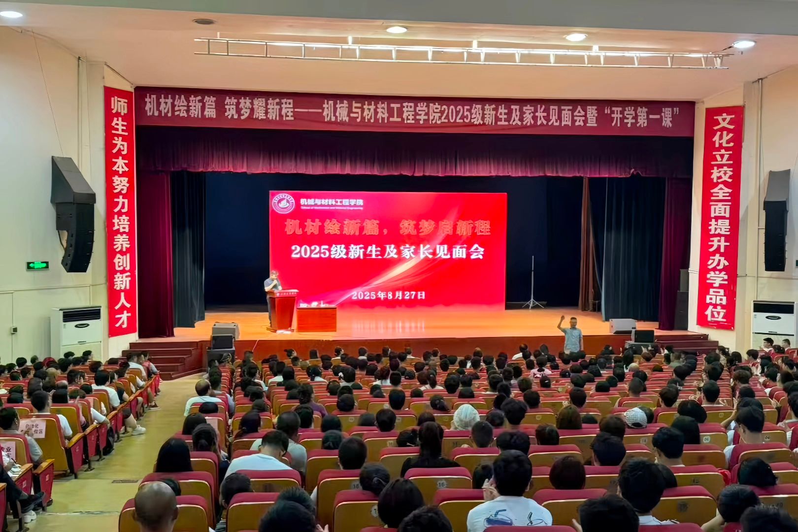 8月27日下午,机械与材料工程学院2025级新生及家长见面会在西安文理学院大礼堂举行。学院领导班子、各系主任、教师代表、全体新生及家长共同参加。党总支书记武文斌主持见面会。见面会上,院长张运良教授全面介绍了学校及学院发展概况,并向新生送上殷切寄语。西安交通大学邱志惠教授为新生讲授“开学第一课”,深入解读智能制造的前沿发展与应用前景。随后,辅导员王月、教学秘书胡锦龙分别就校纪校规、学籍管理与学位授予政策进行详细解读。党总支书记武文斌在总结讲话中寄语新生:以自律为成长起点,学会独立思考与解决问题,积极拥抱人工智能时代,锤炼独立思考、攻坚克难、家国同频的品质,不负韶华,不负热爱。见面会后,学院组织了新生军训动员大会,开启新生大学生活的第一课。