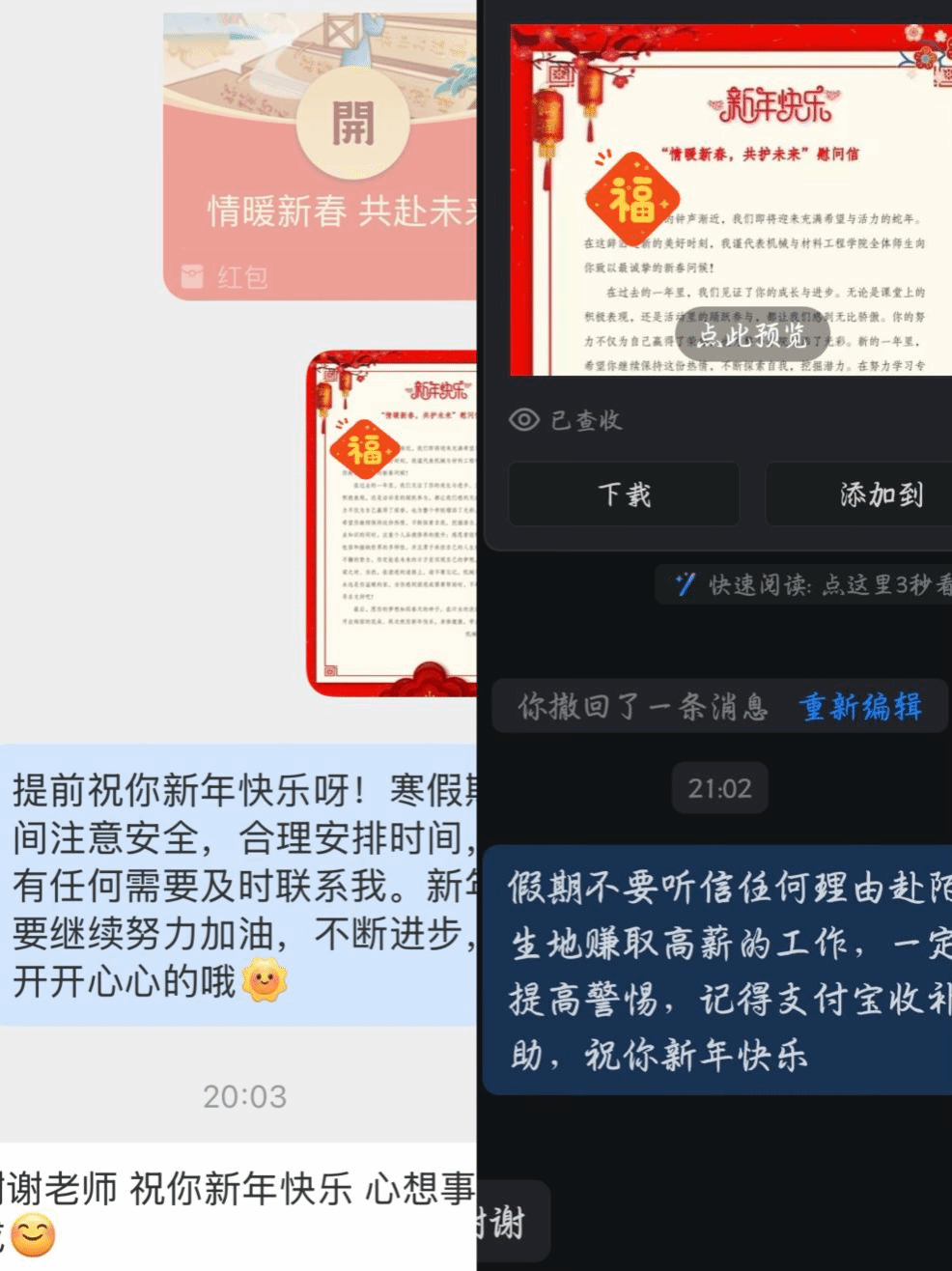 在慰问信中,学院鼓励学生勇敢面对生活中的挑战,珍惜在校学习的机会,努力成长为有理想、有担当的新时代青年。同时,老师们也提醒学生春节期间注意安全,合理安排假期时间,积极参与有益身心健康的活动。受助学生表示,这份来自学院的关爱让他们倍感温暖,他们承诺,将更加努力地学习,不断完善自我,在未来回报社会,传递爱心。